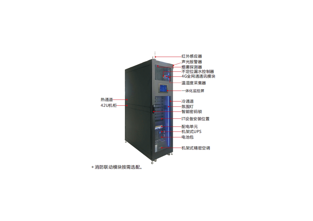 ●机柜前后冷通道封闭,提高空调制冷效率。 ●10寸大屏幕触摸屏本地显示,不占U位。